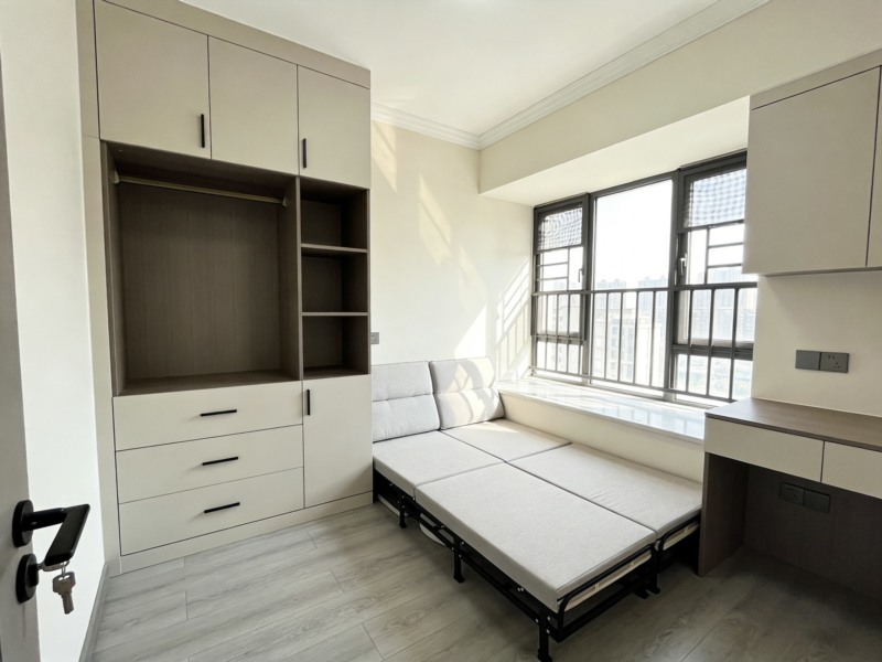 多功能一体化设计是小户型定制的另一大核心策略,通过“一物多用”的设计,让单个空间或家具承载多种功能,减少空间占用。客厅作为家庭活动的核心区域,可采用“沙发床+电视柜组合”的设计:沙发选择可折叠款式,白天作为休息区,夜晚展开变身为客房,满足偶尔留宿需求;电视柜采用组合式设计,整合收纳柜、抽屉与开放格,既能放置电视,又能收纳零食、遥控器、书籍等物品,避免杂乱。厨房与餐厅的联动设计也能提升空间利用率,开放式厨房搭配中岛台,中岛台既可以作为操作台补充厨房空间,又能作为餐桌使用,同时下方设计收纳柜,收纳餐具、厨具,实现“烹饪+用餐+收纳”多功能融合。卧室空间有限时,可将梳妆台与衣柜结合,定制带梳妆台的衣柜,梳妆台嵌入衣柜一侧,使用时展开,不用时收纳,节省空间;儿童房采用“上下床+书桌+收纳柜”的组合设计,上下床满足睡眠需求,床下空间设计抽屉收纳玩具,侧边搭配书桌与书架,实现“睡眠+学习+收纳”一体化。